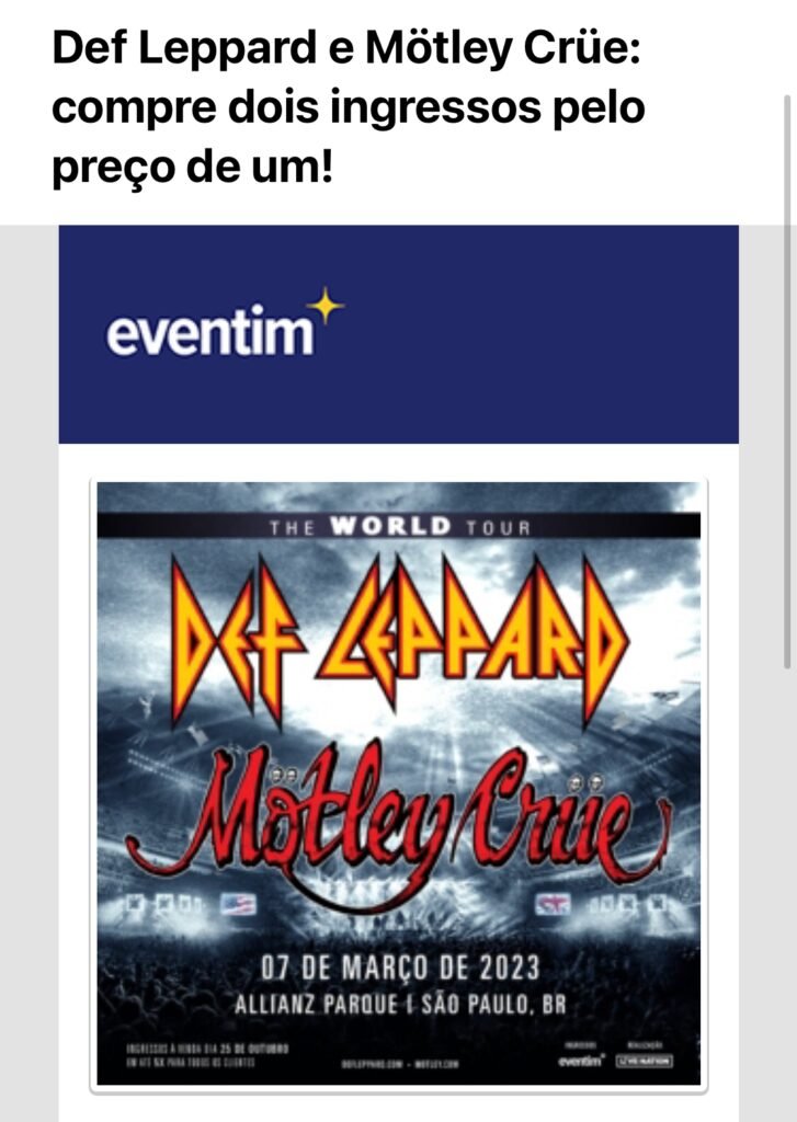 “As lendas do rock mais icônicas e celebradas do mundo estão chegando ao Brasil! Def Leppard e Mötley Crüe desembarcam em São Paulo no dia 07 de março para um show eletrizante no Allianz Parque.