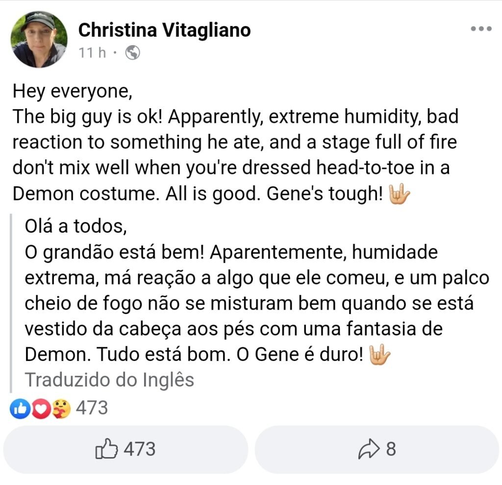 “Ei, pessoal, o cara grandão está bem! Aparentemente a extrema umidade, comida inapropriada e um palco repleto de fogo não se misturam bem quando você está vestido da cabeça aos pés em uma fantasia de Demon. Está tudo sob controle. Gene é durão!” 🤟🏻”