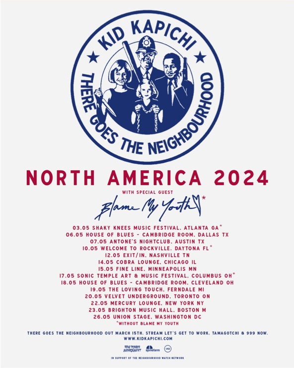 Depois de passar o ano passado na estrada com HARDY, 311 e AWOLNATION, Blame My Youth vai pegar a estrada em maio para uma série de shows nos Estados Unidos em apoio ao Kid Kapichi. Iniciando em Dallas, Texas, em 6 de maio, a turnê passará por mais 9 cidades, incluindo um show na cidade natal da banda, Chicago, em 14 de maio, antes de culminar em Washington DC em 26 de maio. Os ingressos para a turnê estão disponíveis agora em: https://www.blamemyyouth.com/shows.