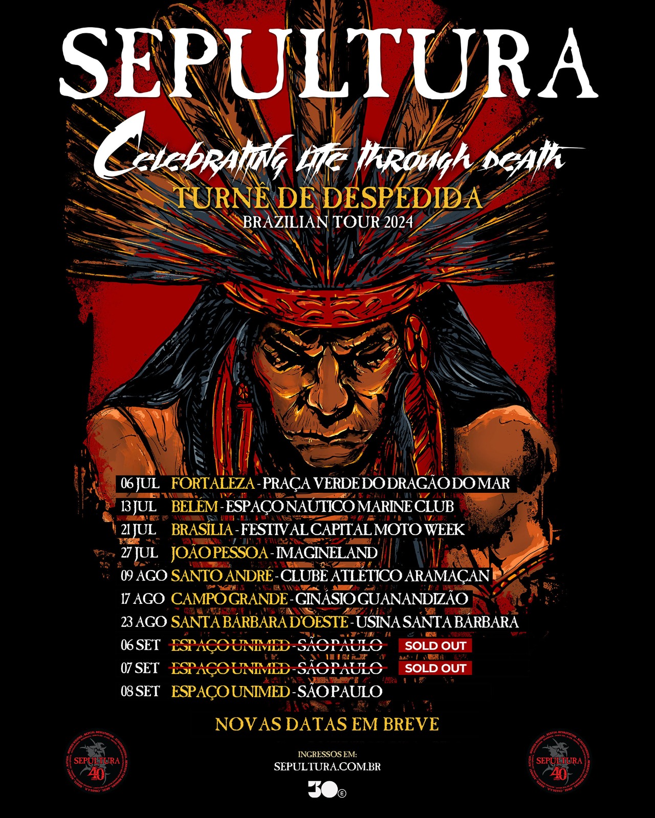 A missão de entregar uma turnê de despedida à altura da história do Sepultura vem sendo atingida com sucesso! Na primeira etapa da tour “Celebrating life through death”, realizada pela 30e, os brasileiros puderam conferir sete apresentações, com datas esgotadas e mais de 30 mil ingressos vendidos. O grupo formado por Andreas Kisser, Derrick Green, Greyson Nekrutman e Paulo Xisto retorna ao Brasil depois de uma passagem pela América Latina e anuncia sete novos shows com início em Fortaleza, no dia 6 de julho, na Praça Verde do Dragão do Mar. Informações sobre a venda de ingressos estão no site oficial da banda – www.sepultura.com.br. Novas datas da tour serão anunciadas em breve.