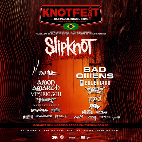 O KNOTFEST Brasil, festival que reúne os maiores nomes do heavy metal ao redor do mundo, anuncia o aguardado line-up de sua segunda edição no país, com 21 bandas internacionais e nacionais. Slipknot será a atração principal das duas noites e fará um show único em cada dia: uma celebração dos 25 anos da banda no dia 19 de outubro (sábado) e um show especial do álbum IOWA (2001) no dia 20 de outubro (domingo). Se apresentam também no sábado (19): Mudvayne; Amon Amarth; Meshuggah; DragonForce; Orbit Culture; Ratos de Porão; Krisiun; Project46; Eminence e Kryour. No line-up de domingo (20), estão: Bad Omens, Till Lindemann; Babymetal; P.O.D.; Poppy; Black Pantera; Ego Kill Talent; Korzus; Papangu e The Mönic com Eskröta. Em uma em uma realização da 30e em parceria com a 5B Artists Management, o KNOTFEST Brasil acontece no Allianz Parque, em São Paulo. Os ingressos estão disponíveis no site da Eventim.