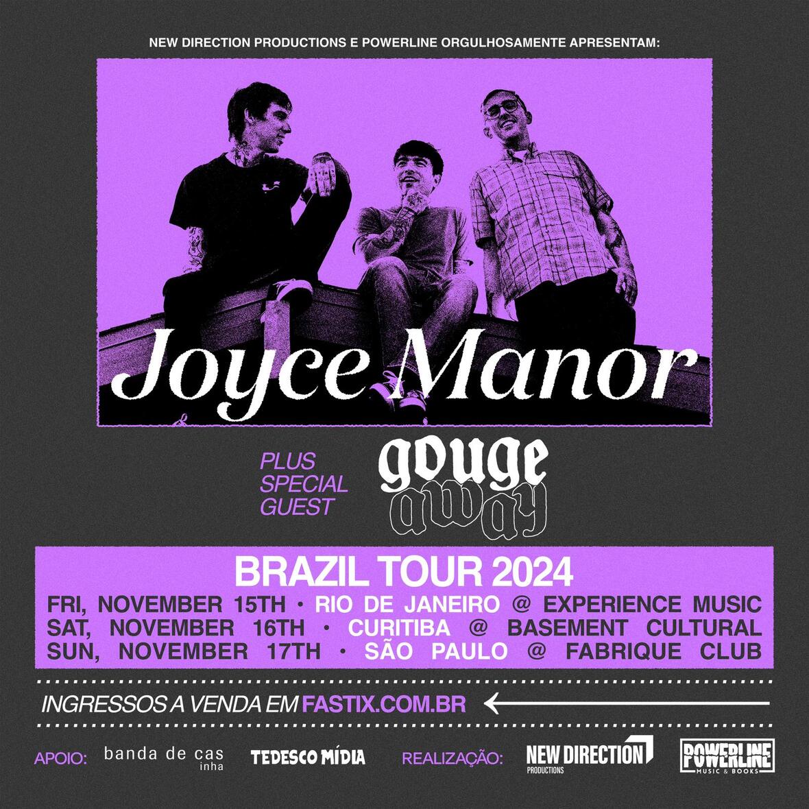 Joyce Manor e Gouge Away se apresentarão em três capitais brasileiras. O giro começa dia 15 de novembro (feriado) no Rio de Janeiro/RJ (Experience Music) e segue dia 16/11 para Curitiba/PR (Basement Cultural). A última data é em São Paulo/SP, no dia 17/11, no Fabrique Club.