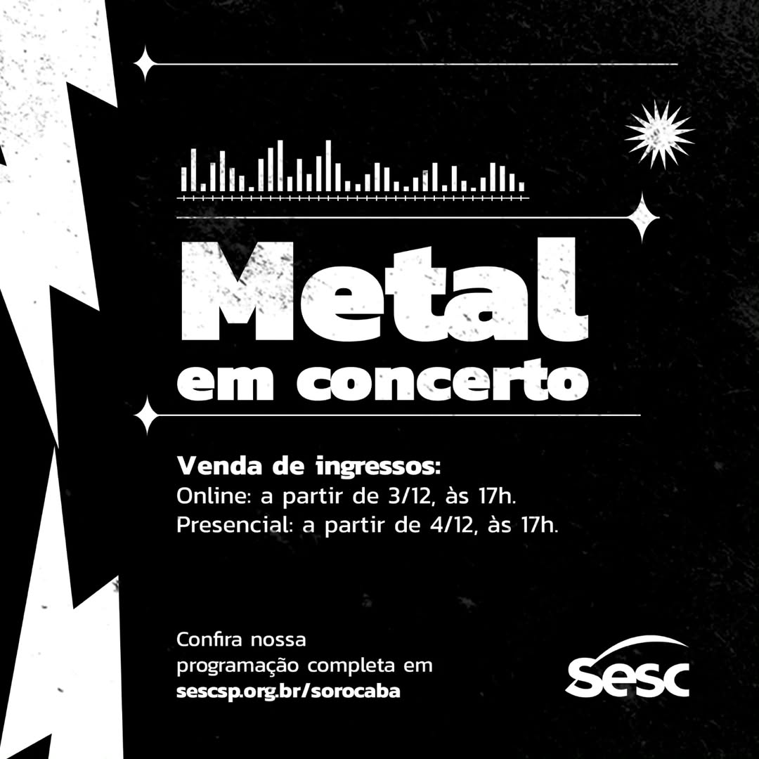 O “Metal em Concerto” do dia 12/12, próxima quinta-feira, reunirá apresentações de Infernal Course e Krisiun a partir das 19h. Já no dia 13, quem sobe ao palco do teatro do Sesc Sorocaba, são Warshipper e Crypta, também a partir das 19h. Os ingressos para os dois dias foram esgotados em horas.