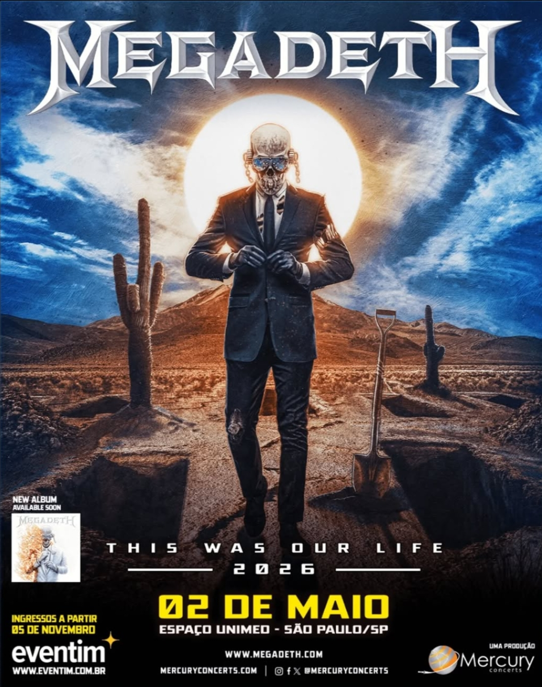 Os fãs brasileiros do Megadeth têm um último encontro marcado com a história do heavy metal. A banda liderada por Dave Mustaine anunciou uma única apresentação no Brasil no dia 2 de maio de 2026 (sábado), no Espaço Unimed, em São Paulo. Com produção da Mercury Concerts, a venda de ingressos para o público geral começa no dia 5 de novembro (quarta-feira), às 10h, pelo site Eventim. E no dia 3 de novembro (segunda-feira), no mesmo horário, será aberta a pré-venda exclusiva para os membros do fã-clube da banda, também pelo site Eventim.